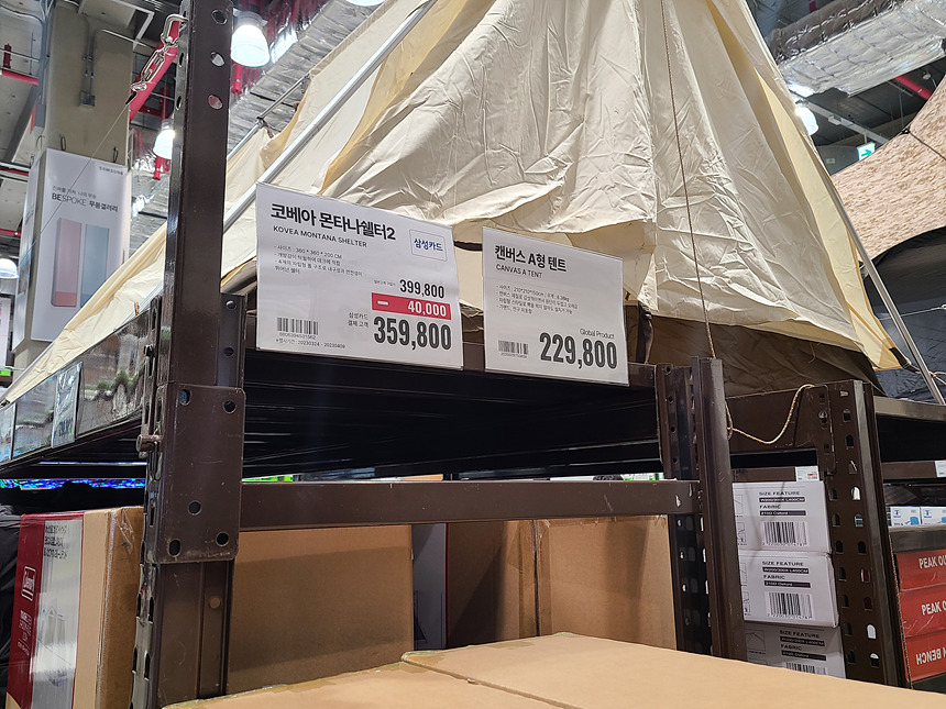 텐트도 있었는데 완전 텐트보다는 가림막 정도의 느낌입니다. 캔버스 A형 텐트, 코베아 몬타나쉘터2 제품이 있습니다.