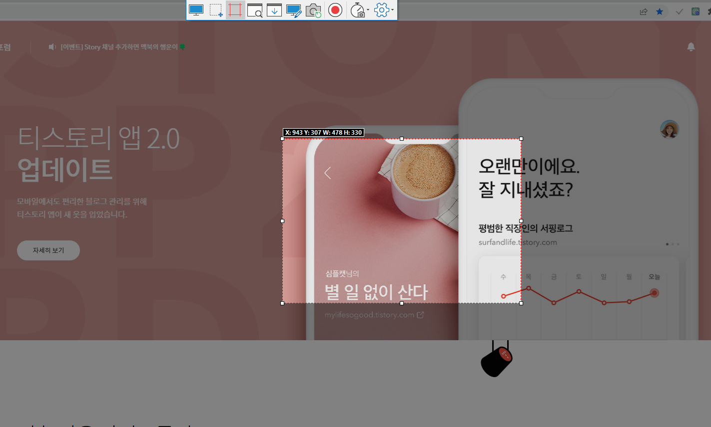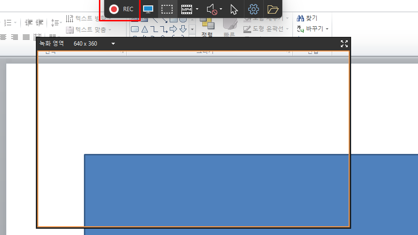 녹화버튼을 눌러 녹화영역을 지정한 뒤 녹화를 진행하겠습니다. 녹화영역 사이즈는 좌측 상단에 표기되어 있습니다.